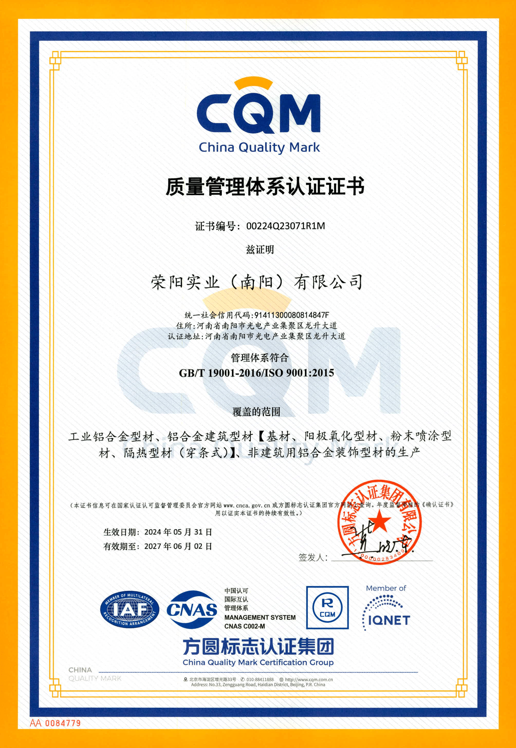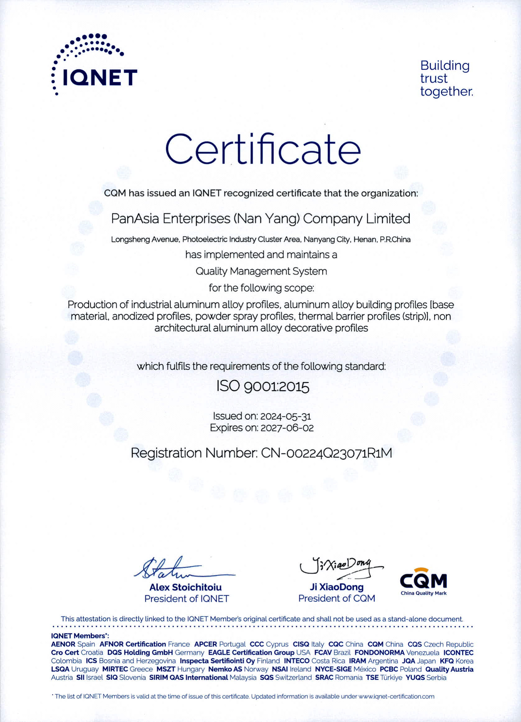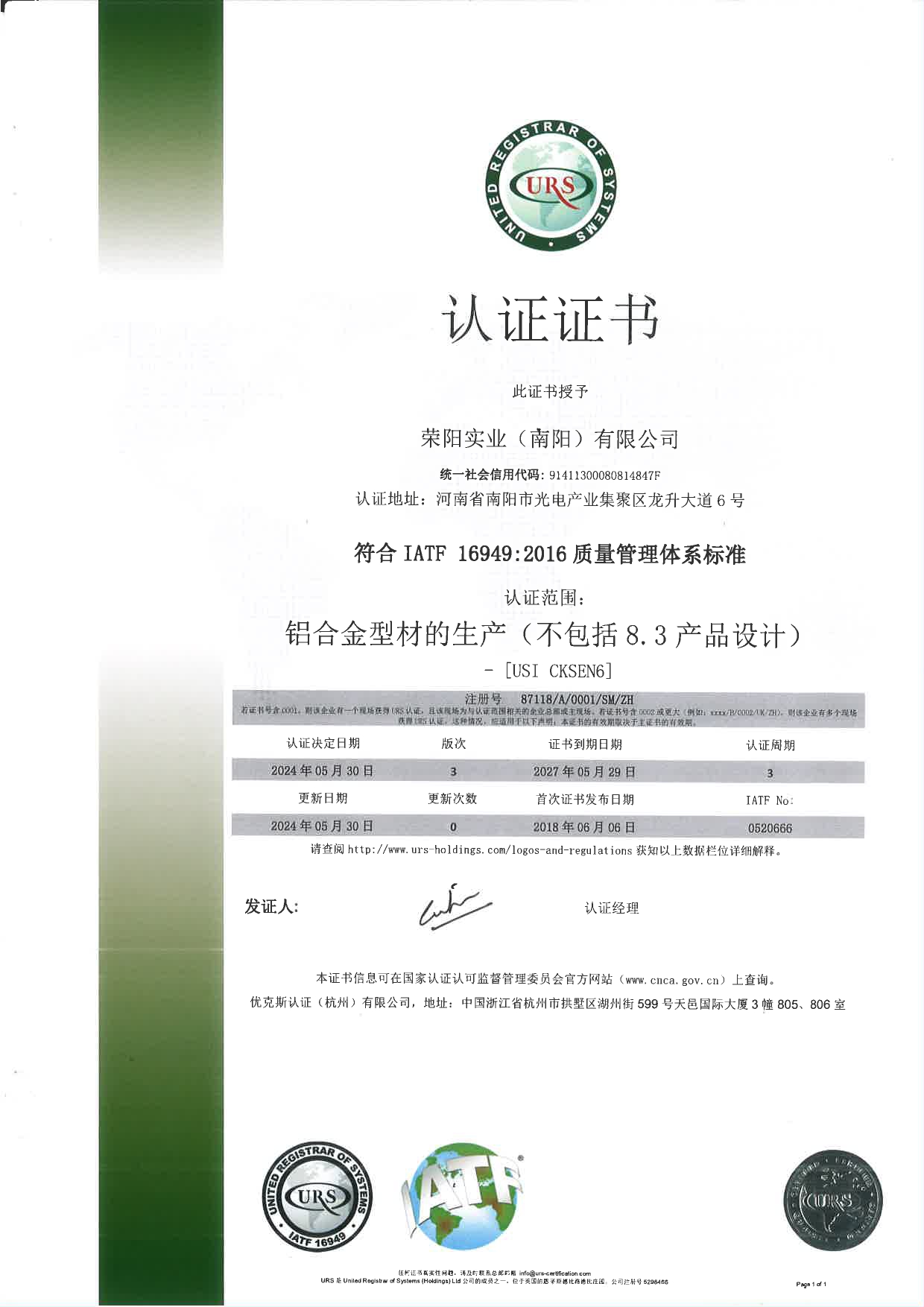URS Certificate (Production of Aluminum Alloy Profiles)