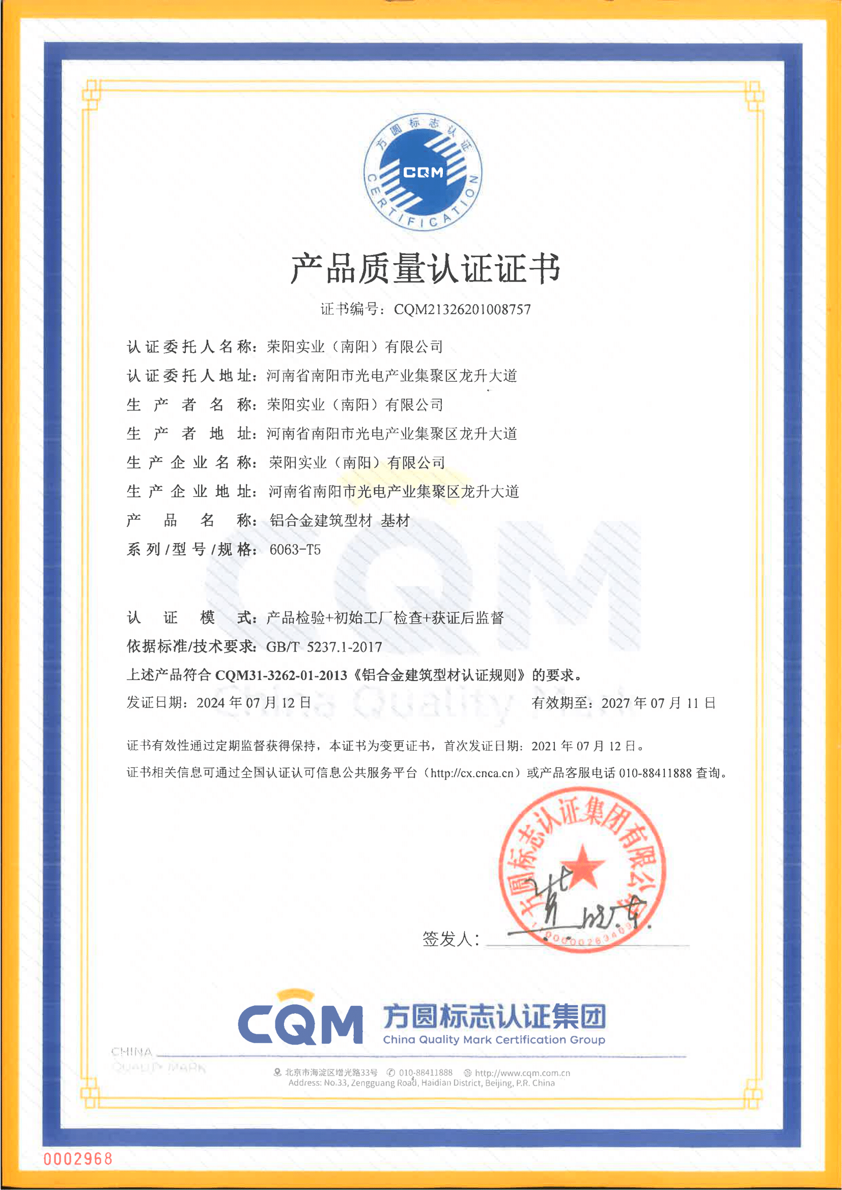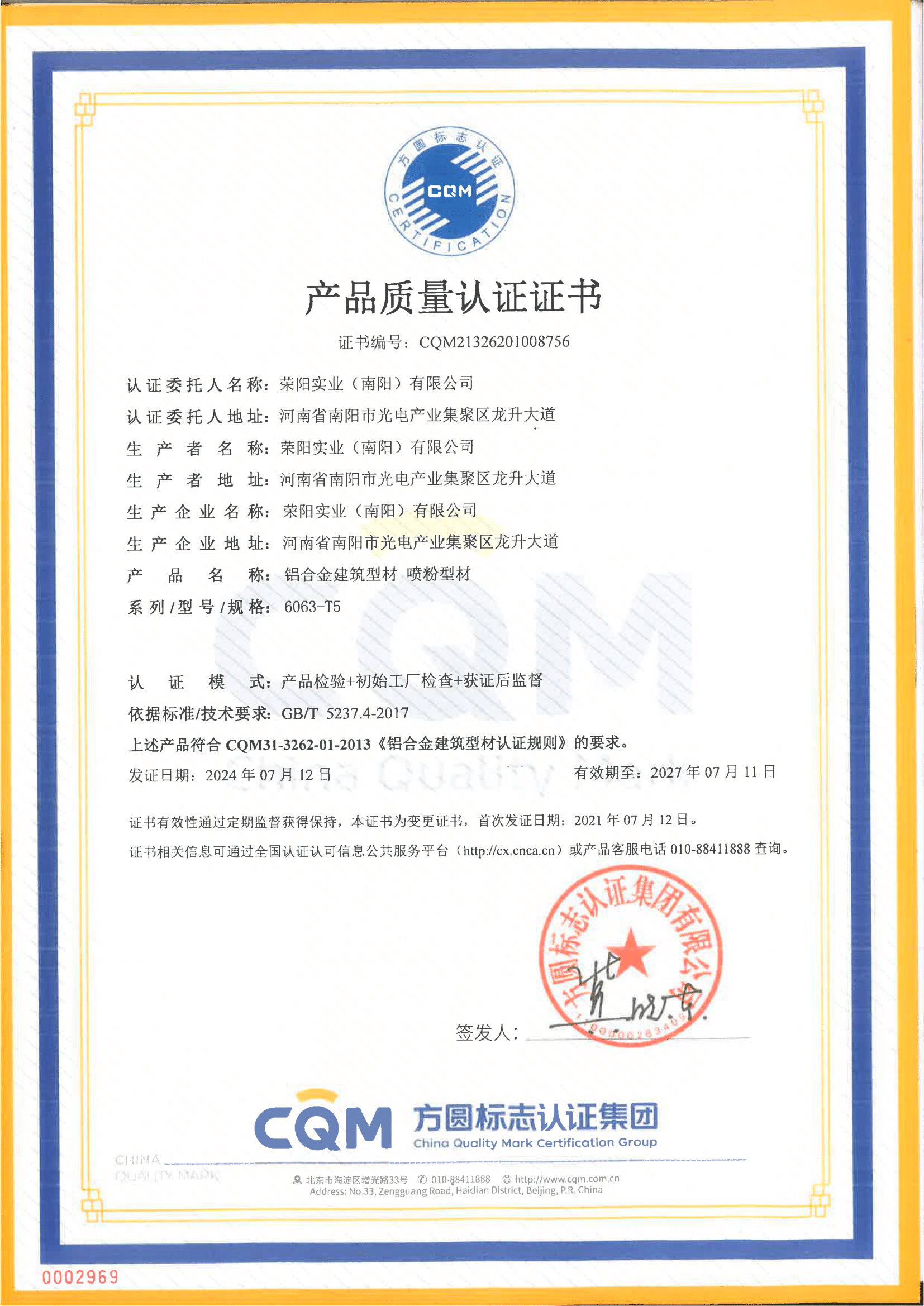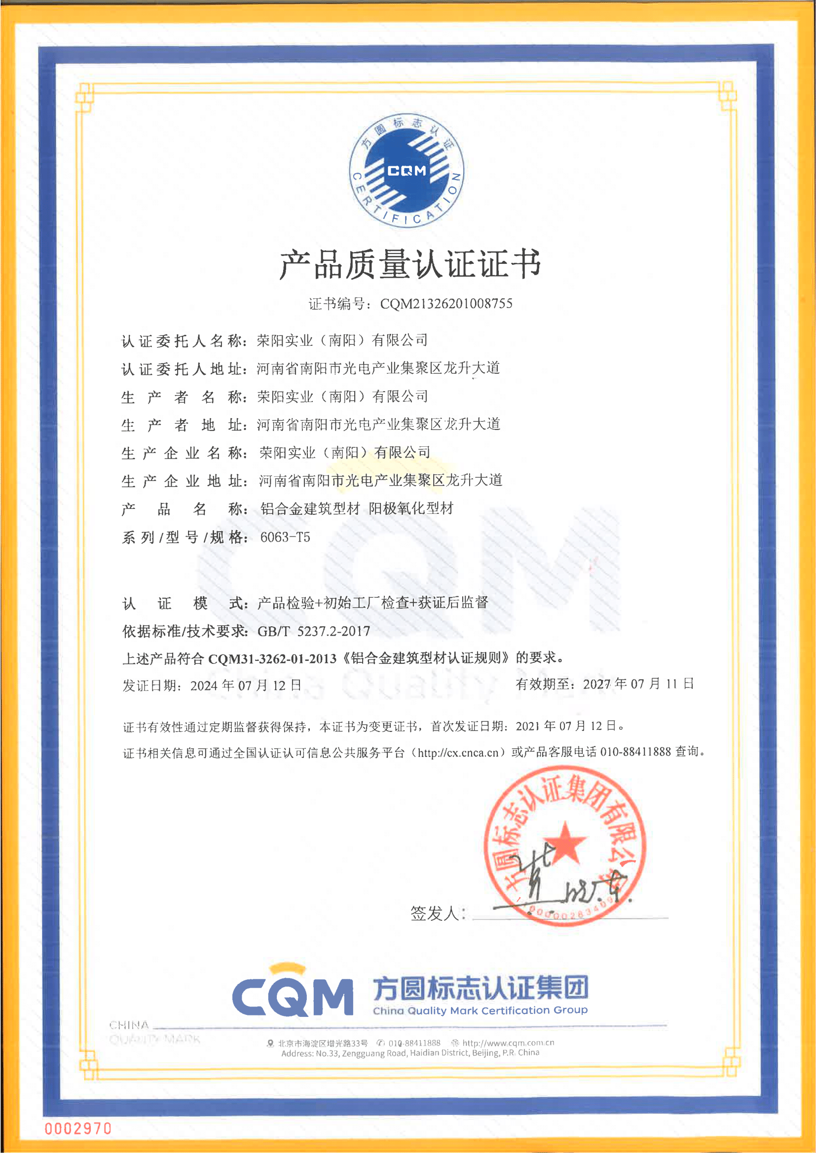 Product Certification - Anodized Profile Product Certification